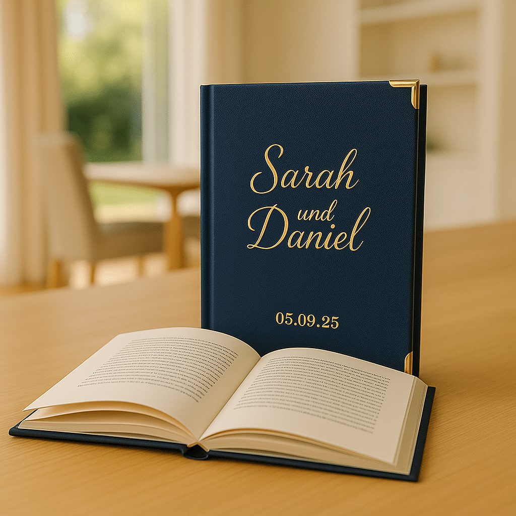 Das Buch ist kein Standarddruck. Es ist edel, schlicht und stilvoll – so wie eure Trauung. Mit Liebe zum Detail gestaltet, fest gebunden und auf hochwertigem Papier gedruckt. Der Einband trägt euren Namen, das Datum eurer Hochzeit – und mit ihm ein kleines Stück Ewigkeit.